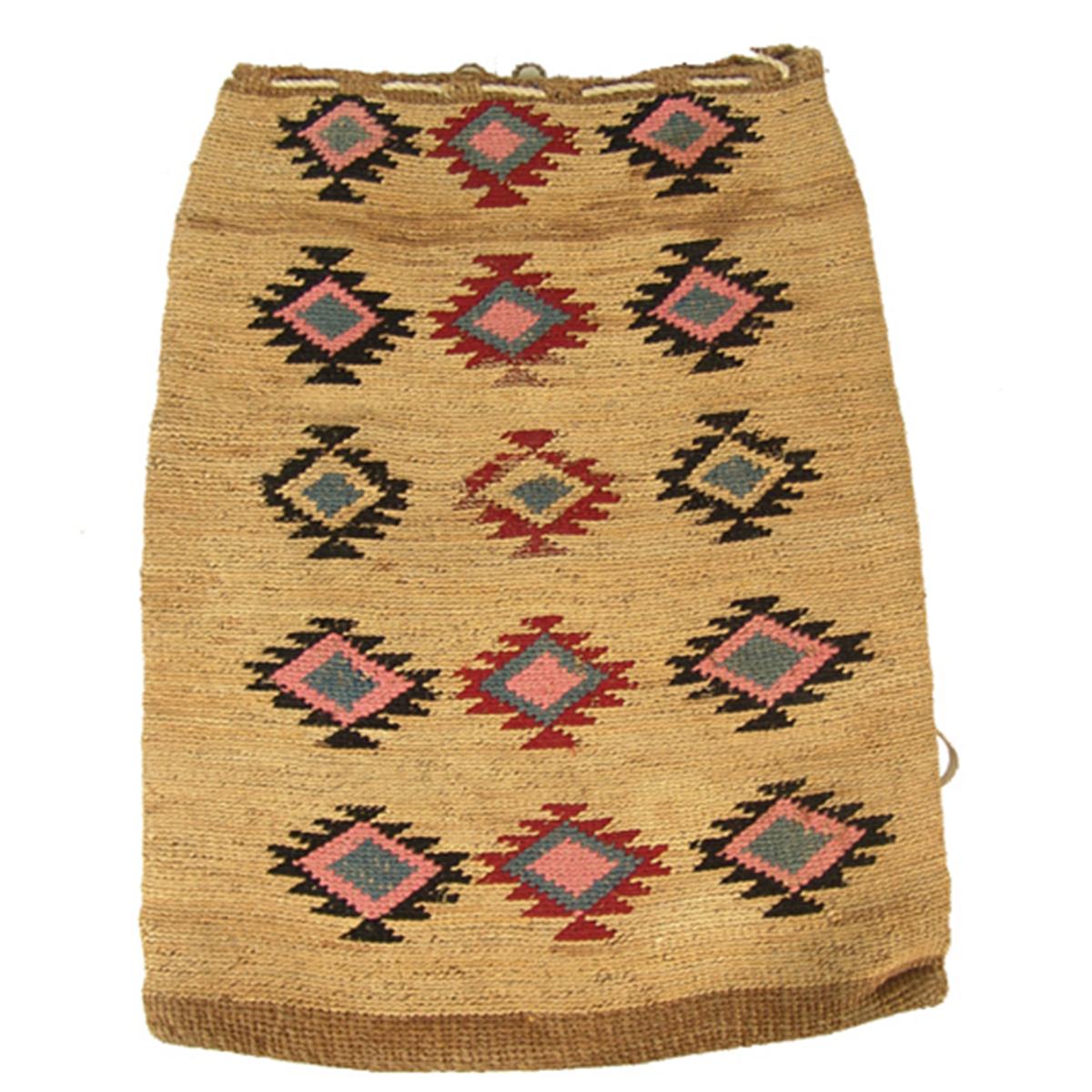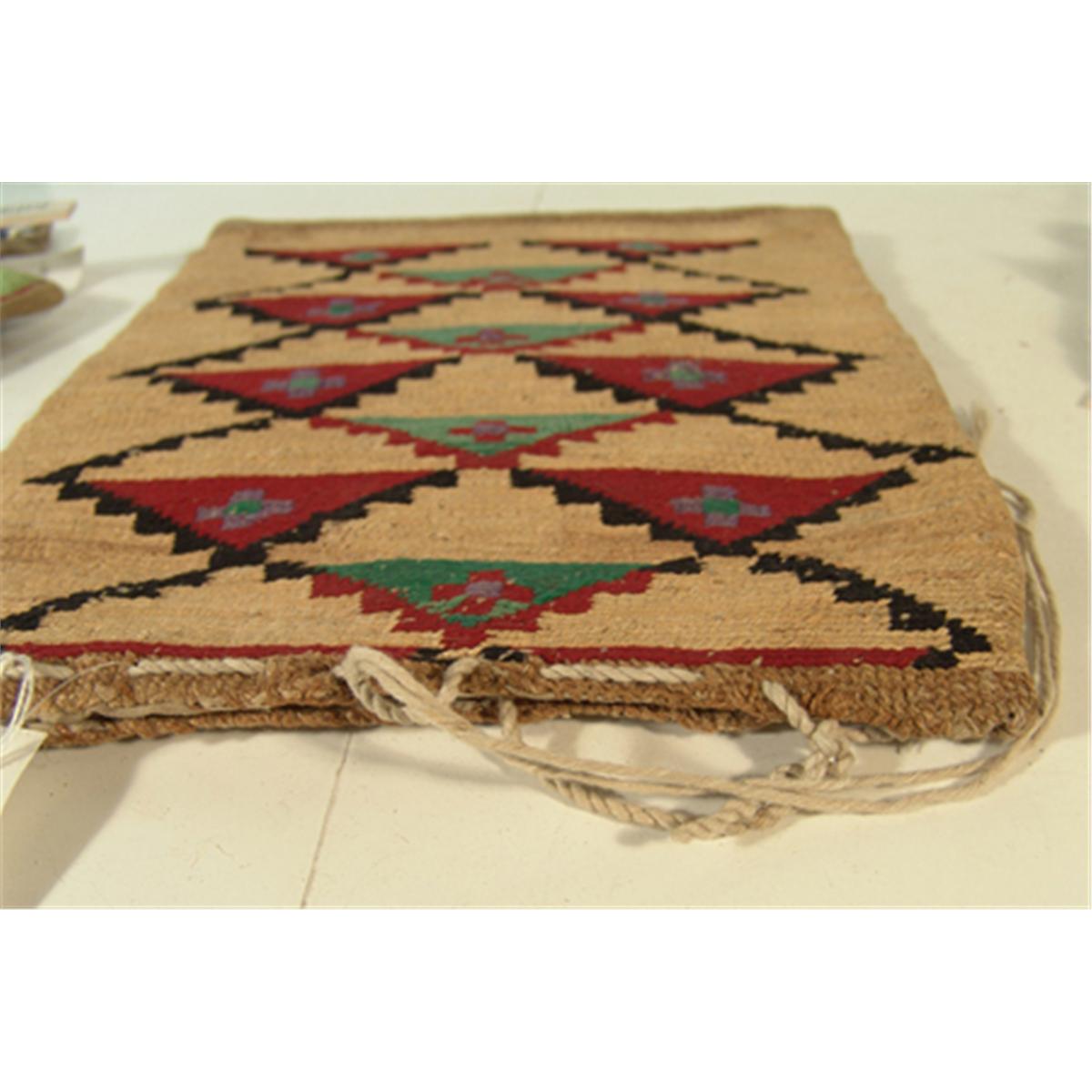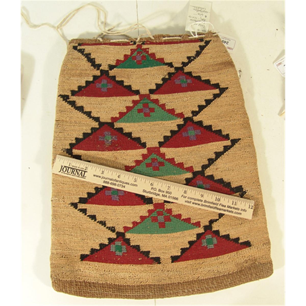 Traditional hand woven bag in rectangular shape with colorful geometric designs done in yarn on both sides. Ex: Huntington Collection. Condition: very good, a few missing yarns. 16-1/2" x 13"