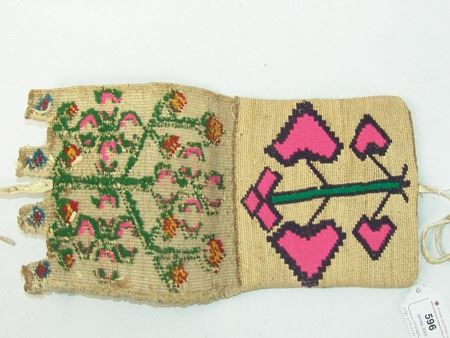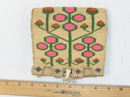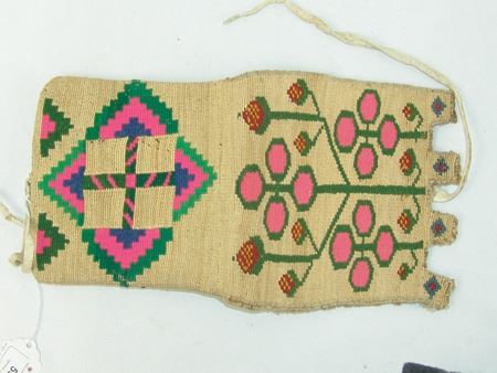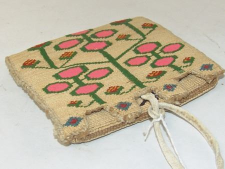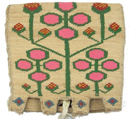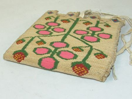 Ca. 1940s, Very fine weave three-panel woven cornhusk belt bag, each panel with colorful woven designs, including strawberries on the flap, and geometrics and florals on the two other body panels. Very good condition, great color, minor edge erosion. 5-7/8" x 6-1/8" x 1/2"
