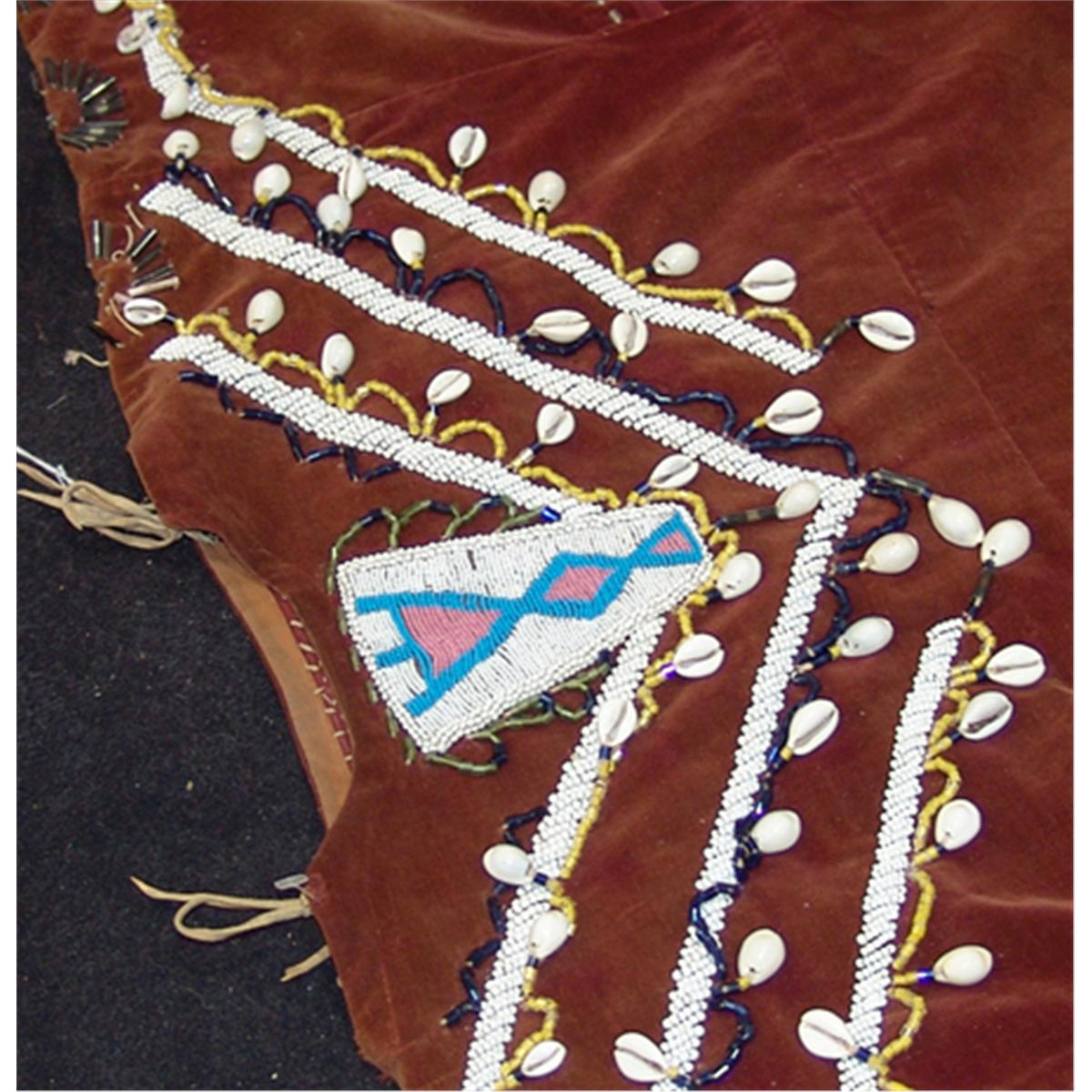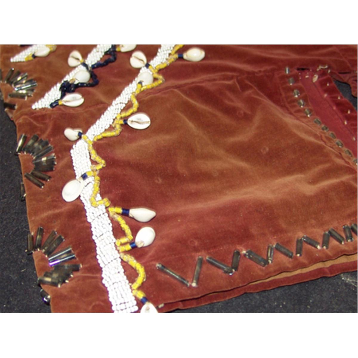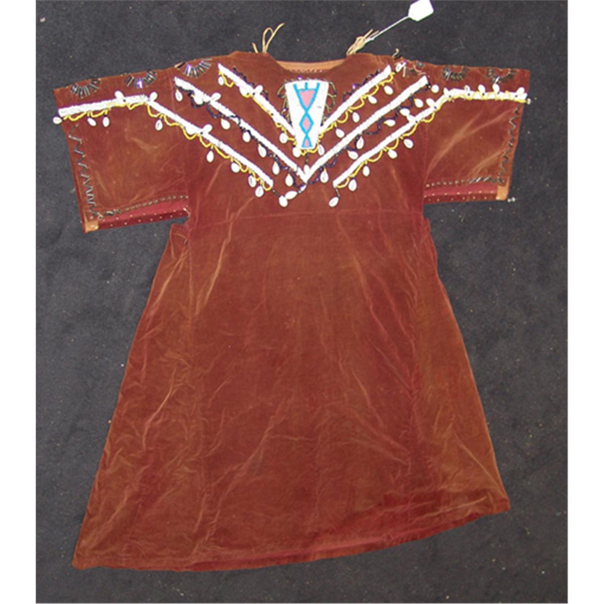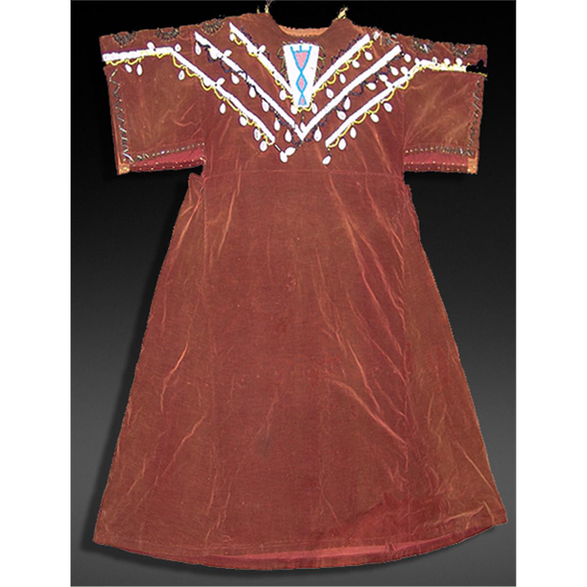 Classic style sewn faded burgundy velvet dress adorned with traditional cowry shells, white pony beads, and finely beaded tabs on front and back of collar. Condition: very good. 43" long.