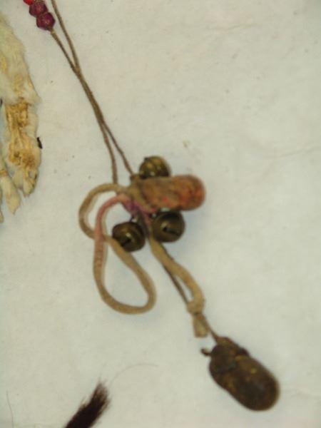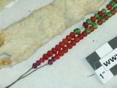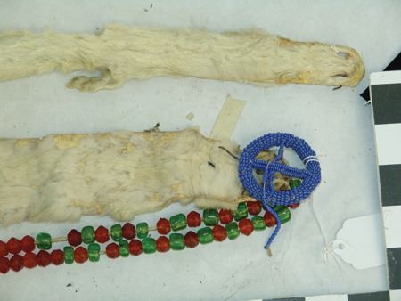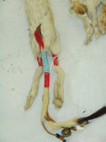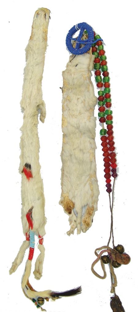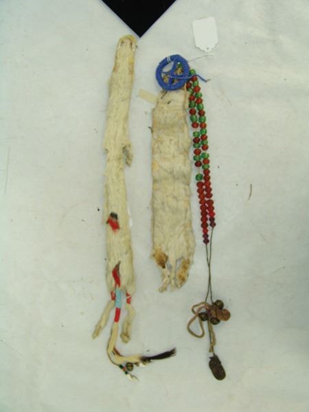 Early/Mid 1900s, Pair of traditional fur adornments used to hang from a dancer's hair or costume, one with beaded medicine wheel and bags and faceted beads, the other with beaded legs and tail. Good condition. Longer 28"