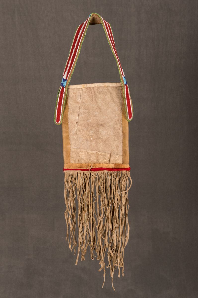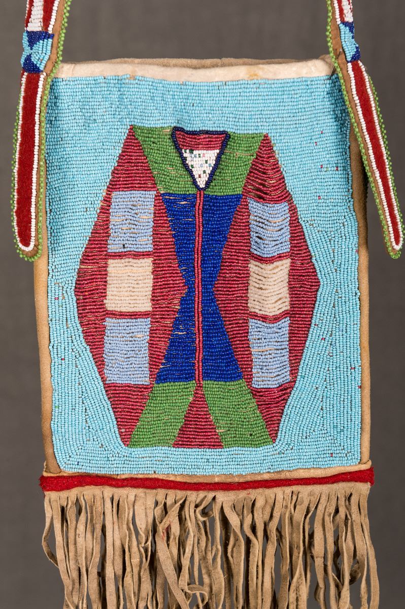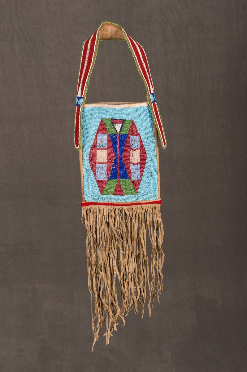 Nez Perce Fully Beaded Mirror Bag. 19" long including fringe x 7" wide. Fully beaded front with partially beaded strap. Early 20th century.