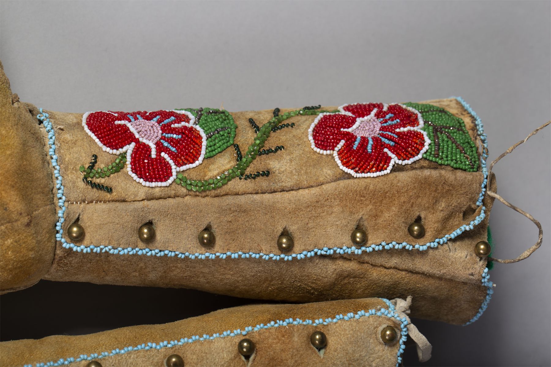 Nez Perce High Top floral design beaded Moccasins; Thread sewn, in green, red, white, brown, navy, light blue and silver beads. Brass buttons on outside on uppers and light blue beaded trim.