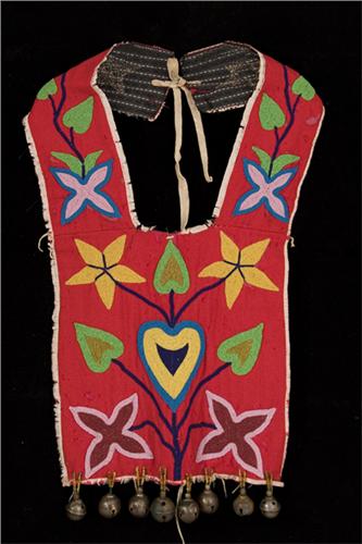 Nez Perce Horse Martingale. 34" x 14". Fine beadwork on red stroud background. Mothing to background and damage to ribbonwork. Beadwork excellent. (est $2,500-3,500)