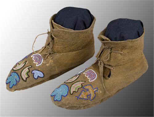 Nez Perce Moccasins. 9 1/2" long. Fine floral beadwork on buffalo hide. c. 1880-1890. (est $1,000-1,500)