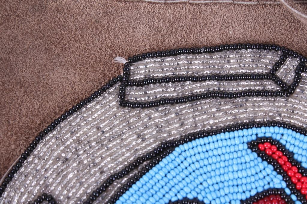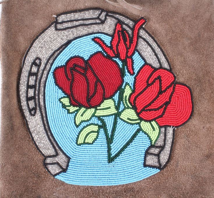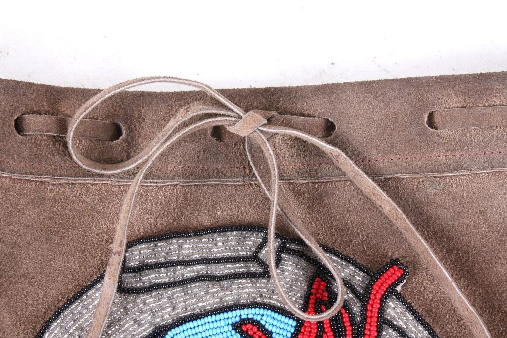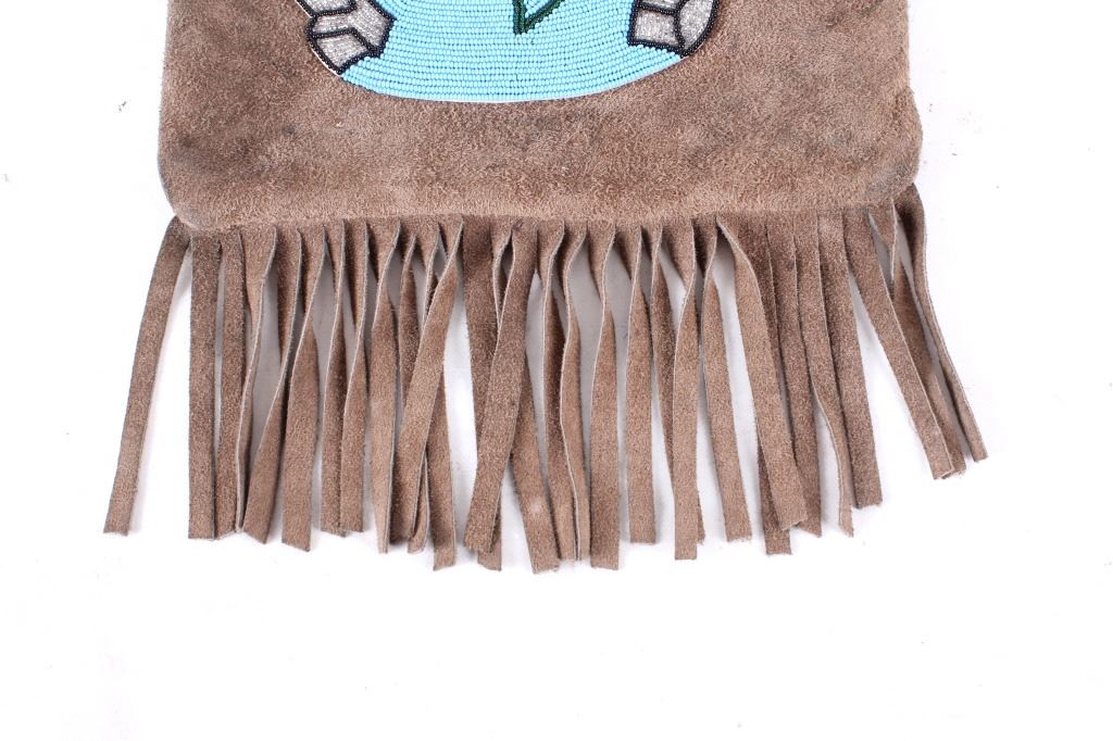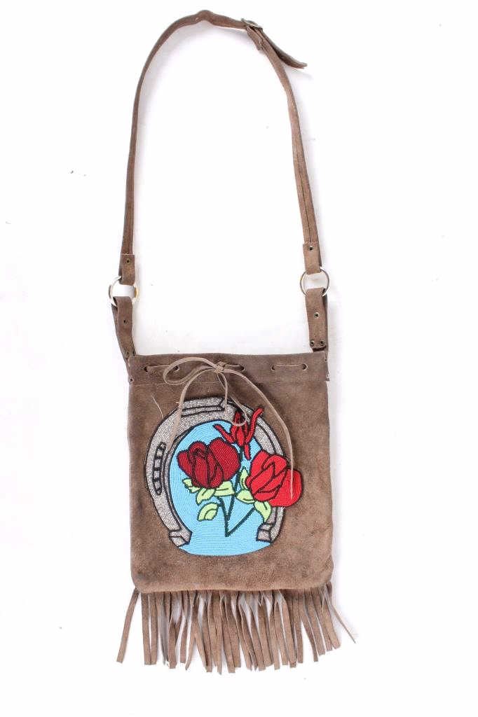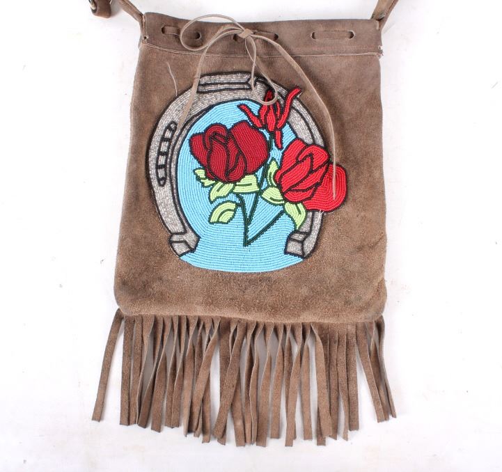 Offered for your bidding pleasure is this Nez Perce Native American Indian Beaded Bag. The Nez Perce are an Indigenous people of the Plateau who have lived on the Columbia River Plateau in the Pacific Northwest region of the United States since at least the 18th century. This piece displays a tanned hide construction with treated leather and shows exceptional beadwork to the front of the bag. The beadwork on the front of the bag displays a silver horseshoe with a blue background and detailed red roses. The bottom of the bag shows a row of 4" fringe. This piece shows excellent condition and quality. The bag measures 10" wide, 16" long.