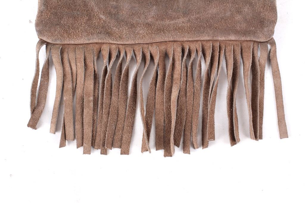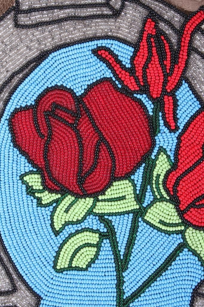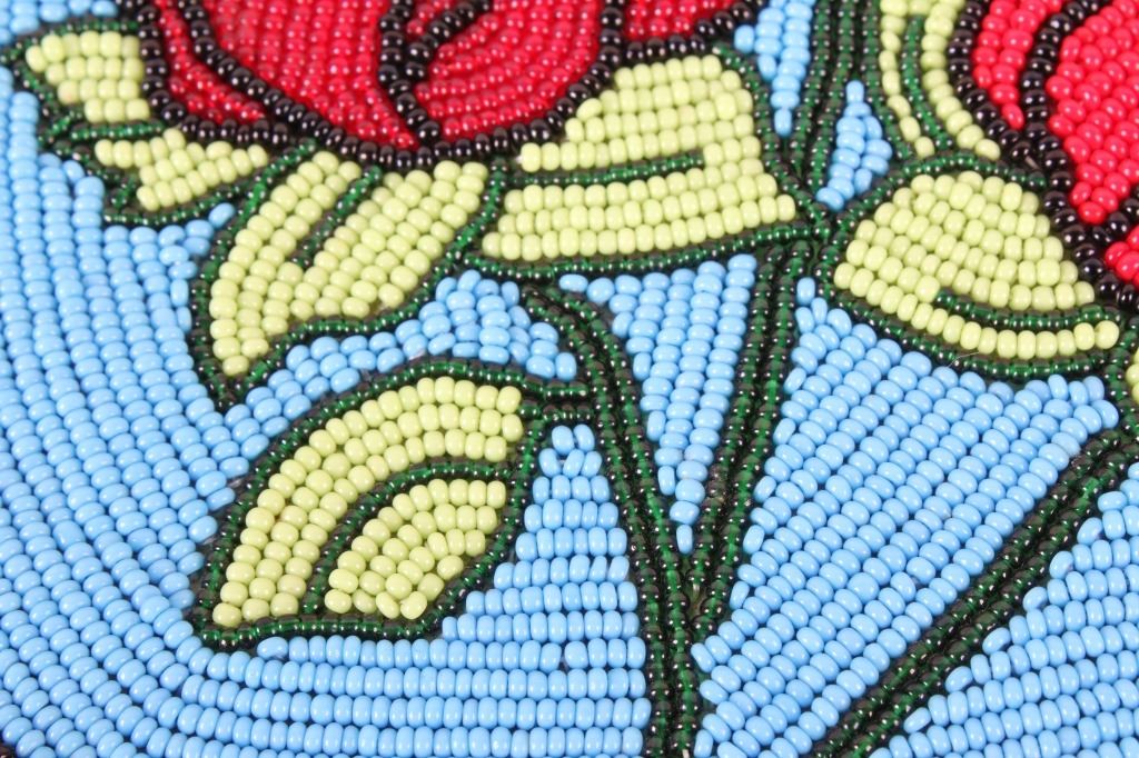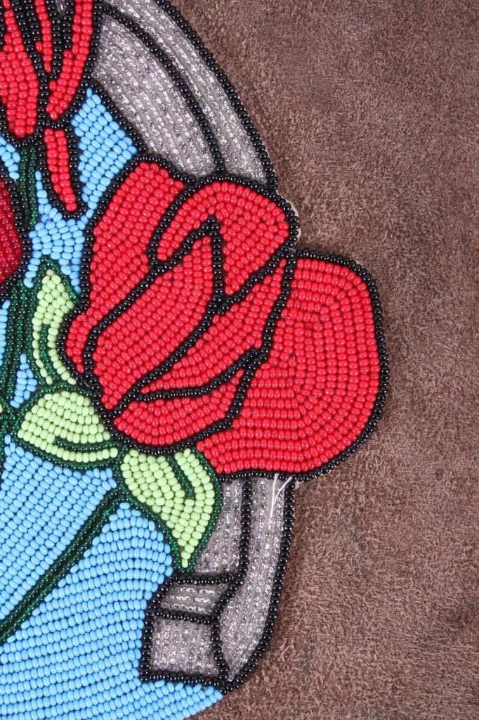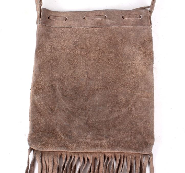 Offered for your bidding pleasure is this Nez Perce Native American Indian Beaded Bag. The Nez Perce are an Indigenous people of the Plateau who have lived on the Columbia River Plateau in the Pacific Northwest region of the United States since at least the 18th century. This piece displays a tanned hide construction with treated leather and shows exceptional beadwork to the front of the bag. The beadwork on the front of the bag displays a silver horseshoe with a blue background and detailed red roses. The bottom of the bag shows a row of 4" fringe. This piece shows excellent condition and quality. The bag measures 10" wide, 16" long.