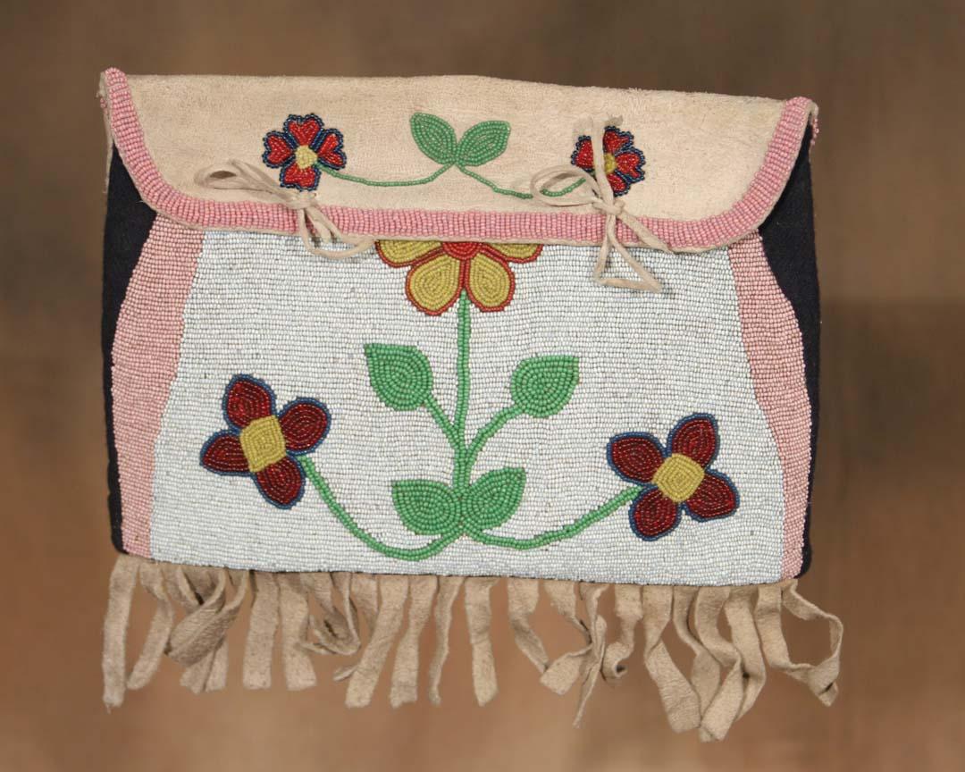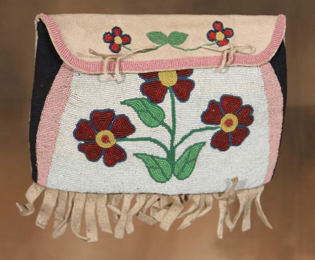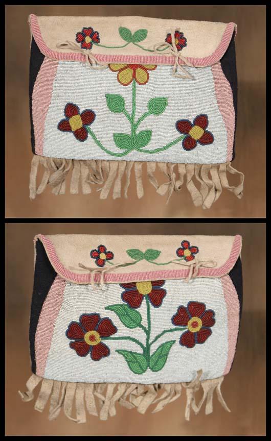 Nez Perce Possible Bags. 10 ½" x 9". Each with different floral beaded designs. Circa 1900. (est $1,000-2,000). For condition reports please visit: www.auctioninsantafe.com/cr2011.pdf