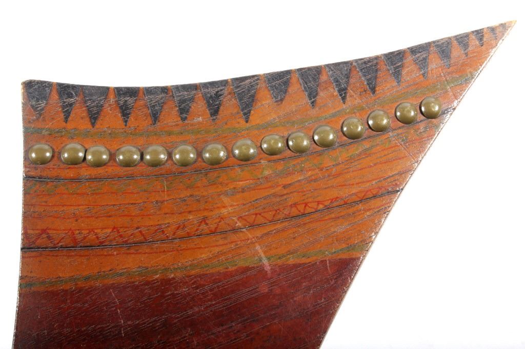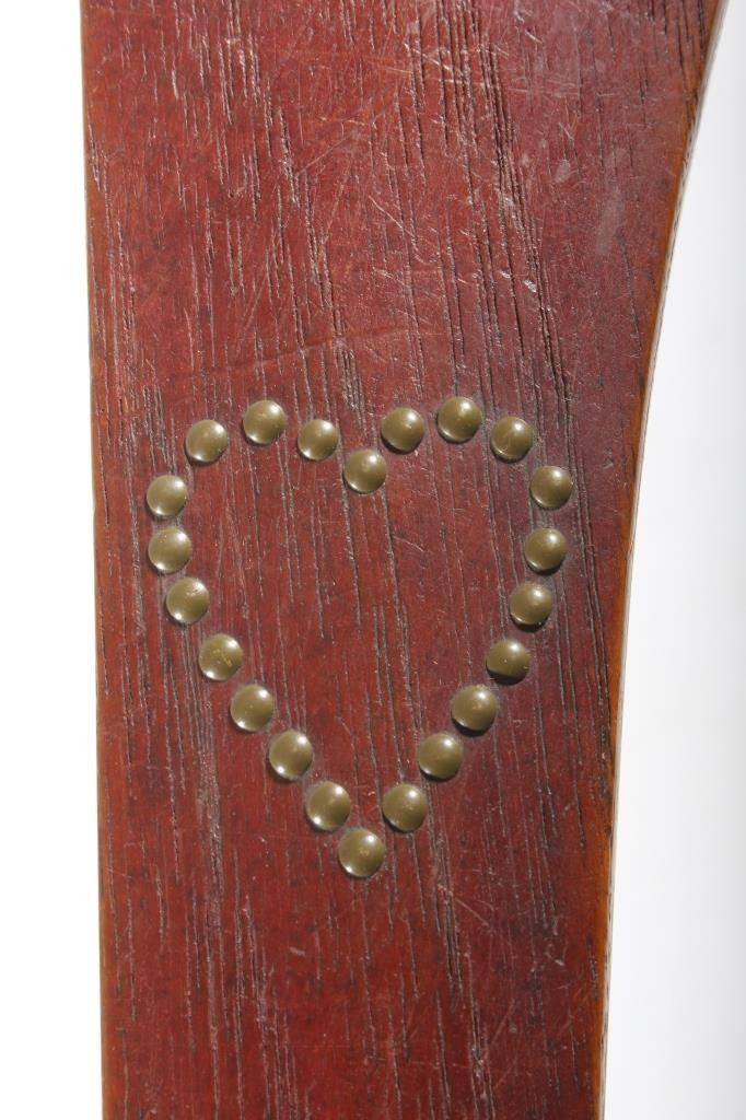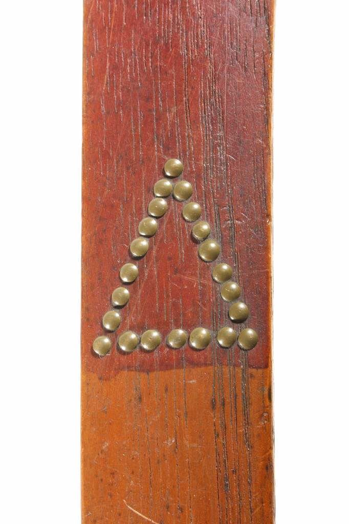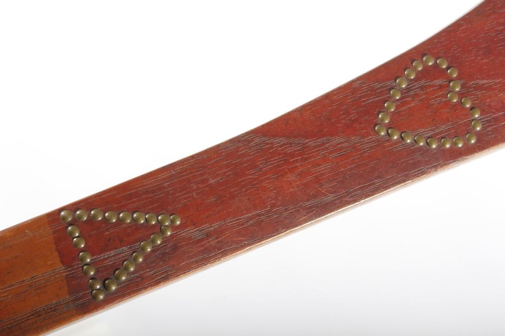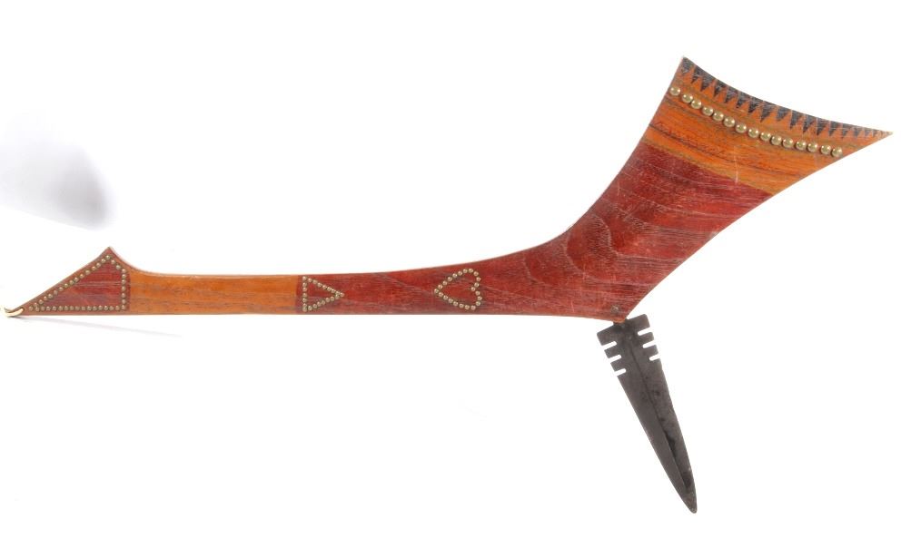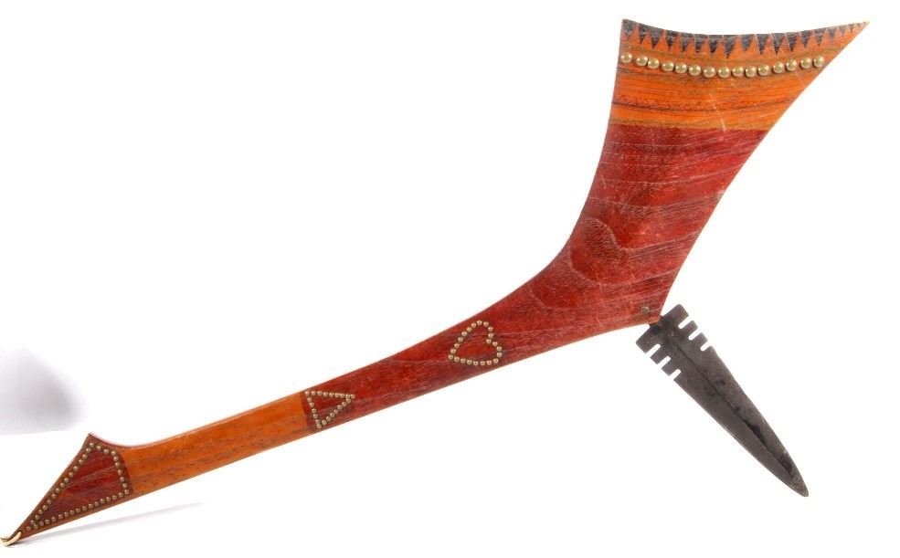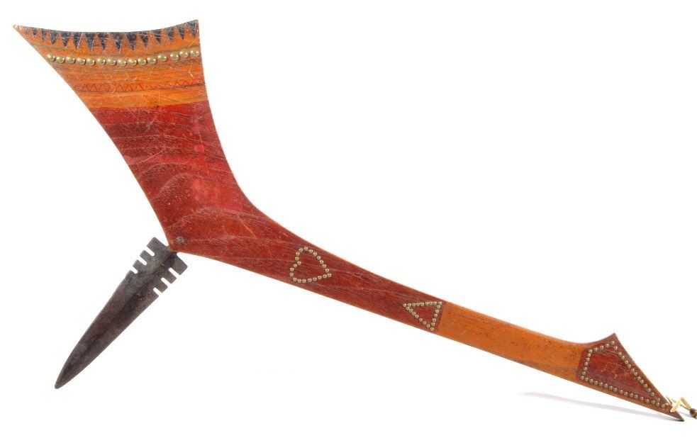 This is an excellent Nez Perce Native American Indian Gunstock & Spontoon War Club from the mid to late 19th century. The highly decorated piece shows immense detail and quality with a Revolutionary War era rifle stock construction. The club also has a Revolutionary War (1775-1783) Colonial American Spontoon blade (the hand forged spike head was used during the Revolutionary War by the Americans in trench defense against charging British infantry or cavalry). The spontoon blade shows a triple or three notched pattern and is held into place with an iron spot. The Gunstock handle shows a red mineral dye with heart and tepee brass trade tack effigies with a framed brass track end. The top of the war club shows brass trade tacks framing the burnt tepee pattern with various drawn accents. This is possibly one of the finest crafted Nez Perce 19th Century Spontoon Gunstock war club made available for private purchase as most war clubs of this quality are in private collections or museum displays. The piece was owned by Saul Sol Webb a Warrior from the Nez Perce in the late 19th century to early 20th century and was handed down through his family. A small buckskin hide suspension with some brass trade tacks glorify the handle. Provenance: The war club was purchased directly from Jimmy Webb, son of Sol Webb, of Pendleton, Oregon and was also part of the same collection of Bessie Cawapoo daughter of Like Cawapoo, Chief of the Nez Perce. This tomahawk is published and photographed on the Trade Axe and Tomahawk Collectors Association website. Head has a unique spontoon spear head style European influence design. Rare important Indian artifact. Measures overall 28.25”L x 14”W with a 6.5”L x 1.75”W spontoon blade.