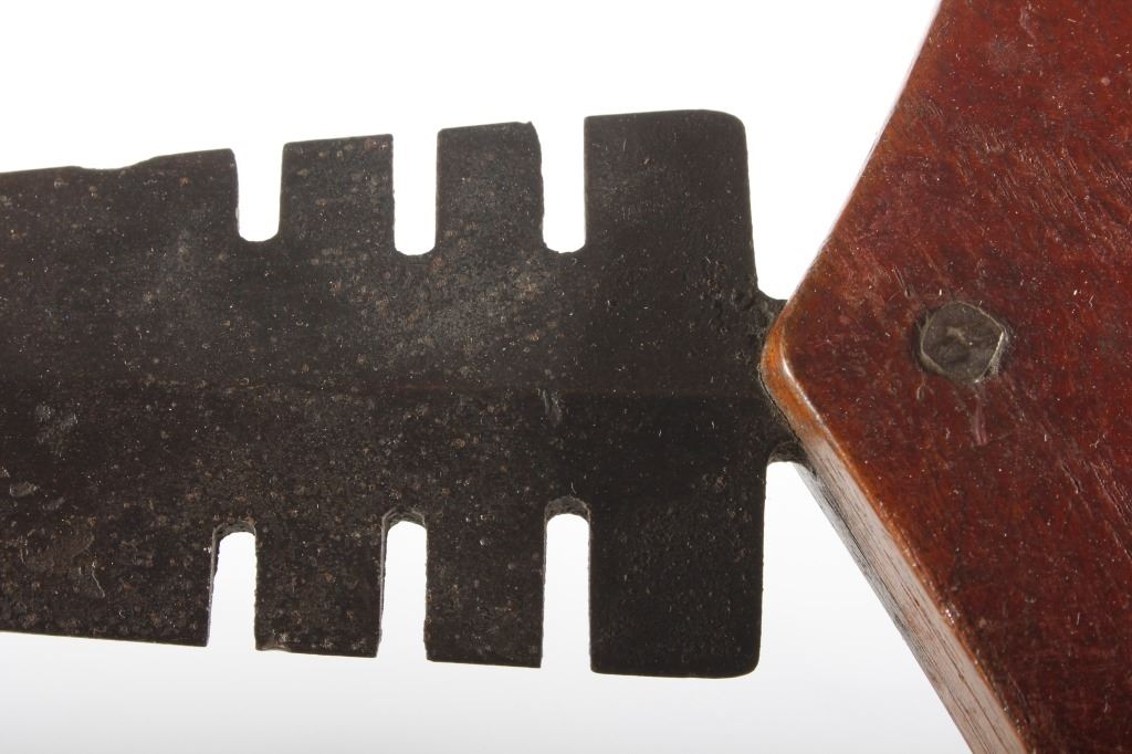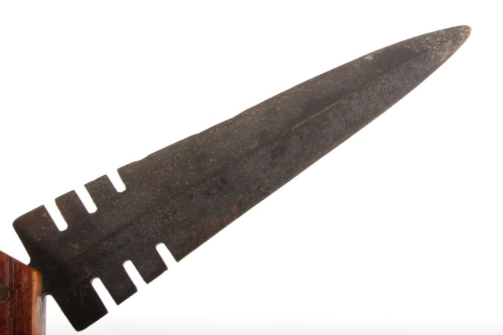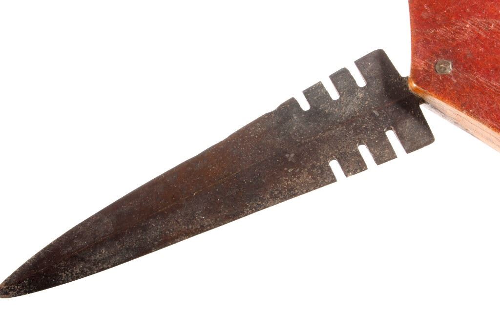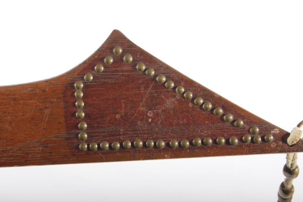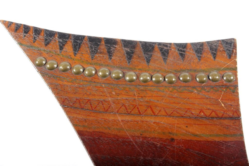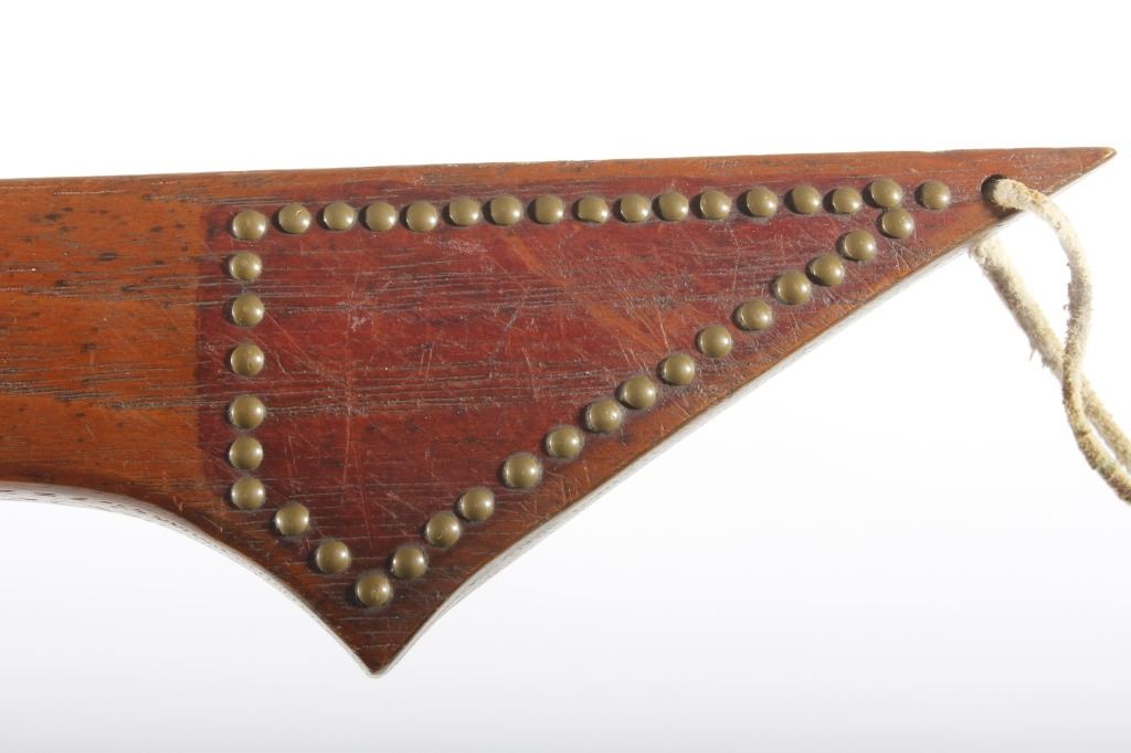 This is an excellent Nez Perce Native American Indian Gunstock & Spontoon War Club from the mid to late 19th century. The highly decorated piece shows immense detail and quality with a Revolutionary War era rifle stock construction. The club also has a Revolutionary War (1775-1783) Colonial American Spontoon blade (the hand forged spike head was used during the Revolutionary War by the Americans in trench defense against charging British infantry or cavalry). The spontoon blade shows a triple or three notched pattern and is held into place with an iron spot. The Gunstock handle shows a red mineral dye with heart and tepee brass trade tack effigies with a framed brass track end. The top of the war club shows brass trade tacks framing the burnt tepee pattern with various drawn accents. This is possibly one of the finest crafted Nez Perce 19th Century Spontoon Gunstock war club made available for private purchase as most war clubs of this quality are in private collections or museum displays. The piece was owned by Saul Sol Webb a Warrior from the Nez Perce in the late 19th century to early 20th century and was handed down through his family. A small buckskin hide suspension with some brass trade tacks glorify the handle. Provenance: The war club was purchased directly from Jimmy Webb, son of Sol Webb, of Pendleton, Oregon and was also part of the same collection of Bessie Cawapoo daughter of Like Cawapoo, Chief of the Nez Perce. This tomahawk is published and photographed on the Trade Axe and Tomahawk Collectors Association website. Head has a unique spontoon spear head style European influence design. Rare important Indian artifact. Measures overall 28.25”L x 14”W with a 6.5”L x 1.75”W spontoon blade.