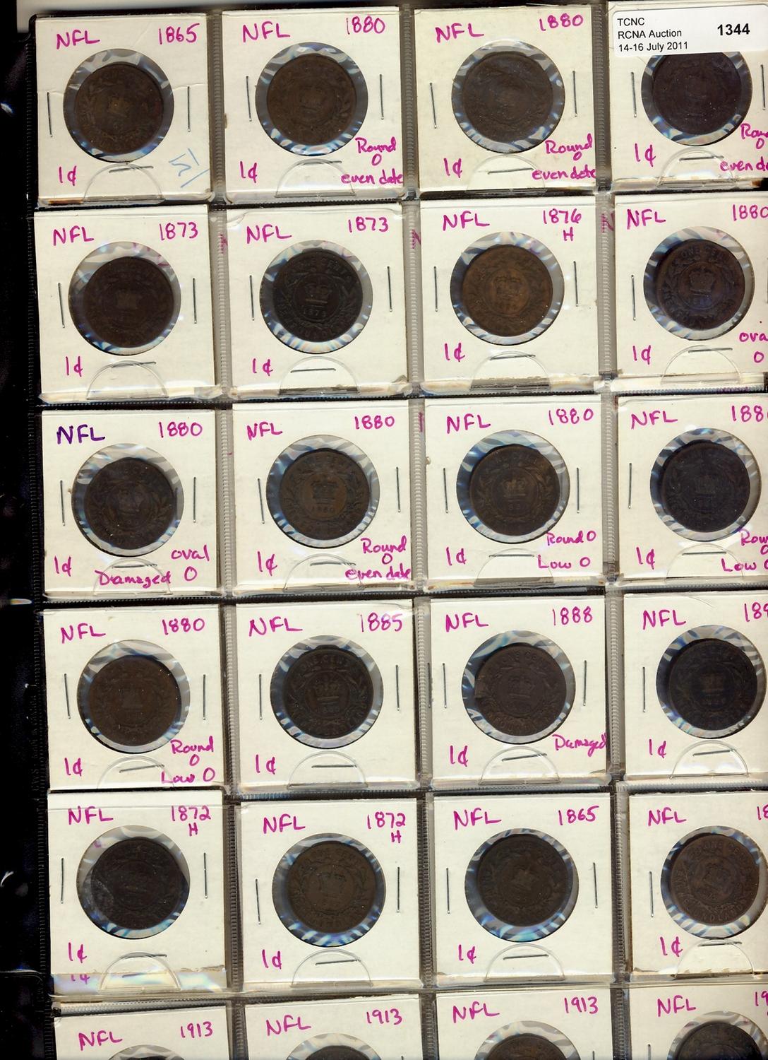 Nfld 1¢ Complete date set, lot of 72 pieces. Includes the scarce 1880 Oval O, also some duplicates. Grades vary from AG-2 to EF-40.