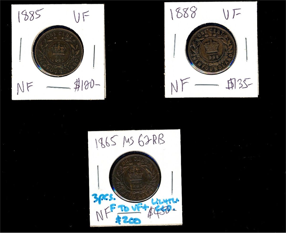 Nfld 1865 1¢, 1885 & 1888. Lot of 3 coins F to VF+.