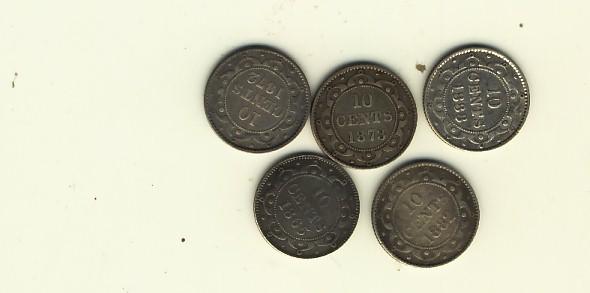 Nfld 1865 10¢, 1872H, 1873, 1882H & 1888.  Lot of 4 coins all Fine or slightly better.  1888 shows some light hairlines.
