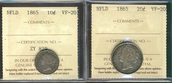 Nfld 1865 10¢ & 20¢ ICCS VF20. Lot of 2 coins.