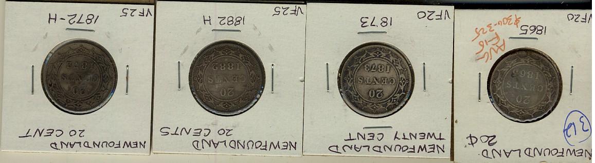 Nfld 1865, 1872H, 1873, 1882H, average grades F15, 4 pieces.