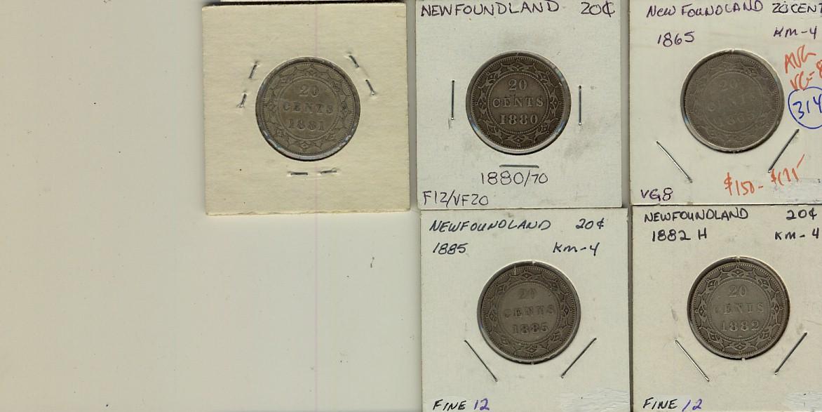 Nfld 1865, 1880, 1881, 1882H, 1885 20¢, average grades VG8, 5 pieces.