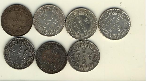 Nfld 1865(2) 20¢, 1872(3) & 1873(2). Lot of 7 coins VG to VF with minor problems.