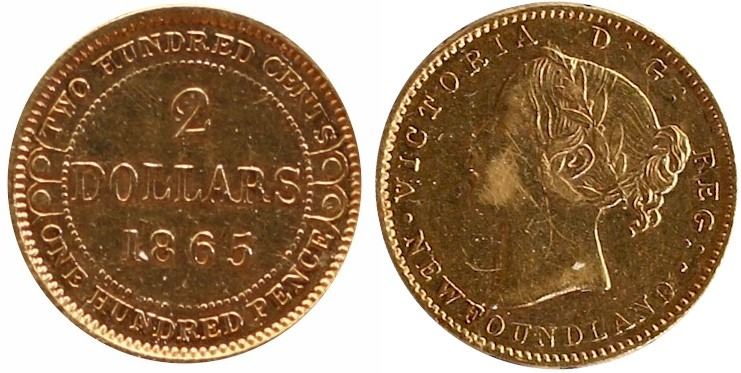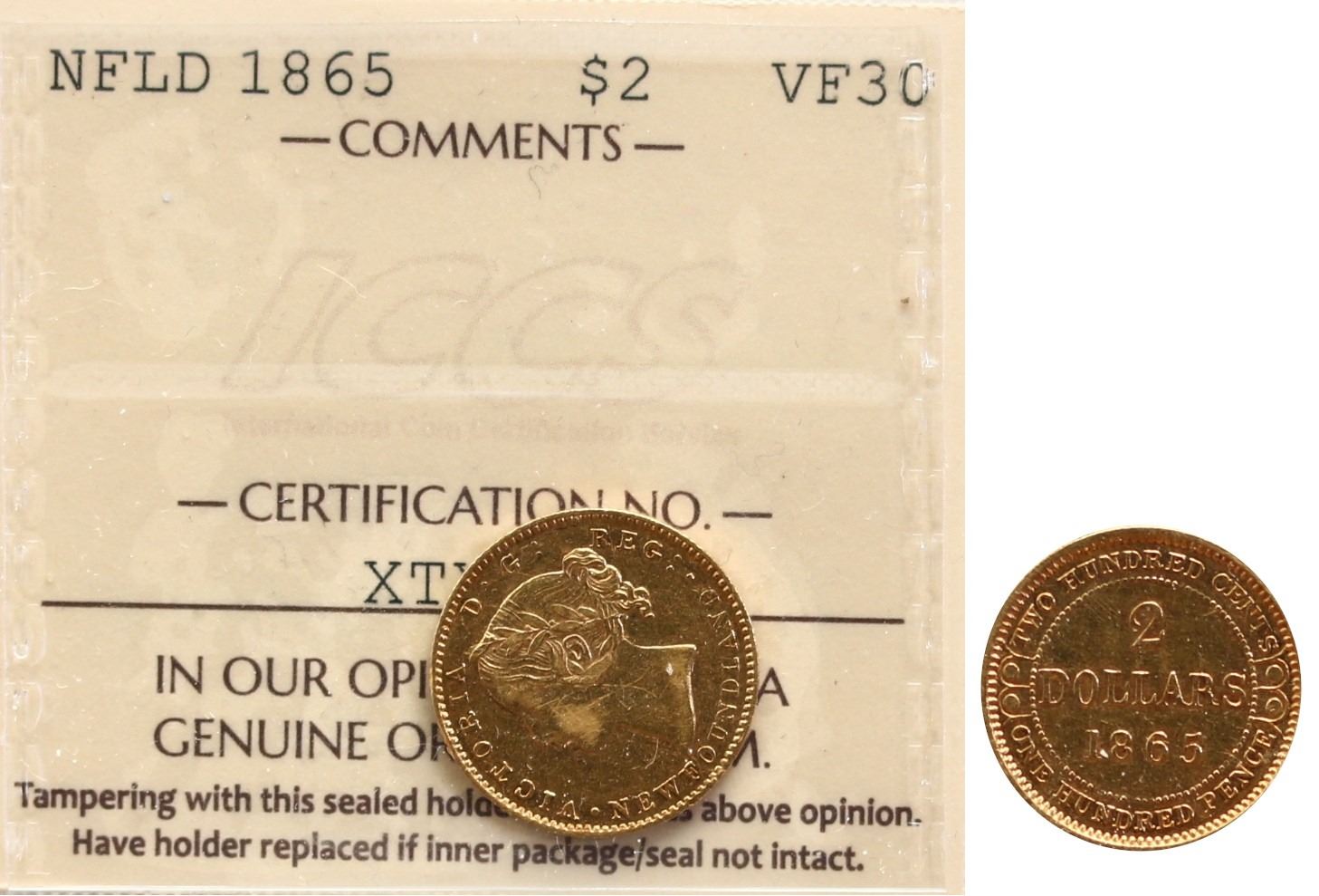 Nfld; 1865 $2 Gold ICCS Choice Very Fine-30. Overall nice example. Very popular issues.