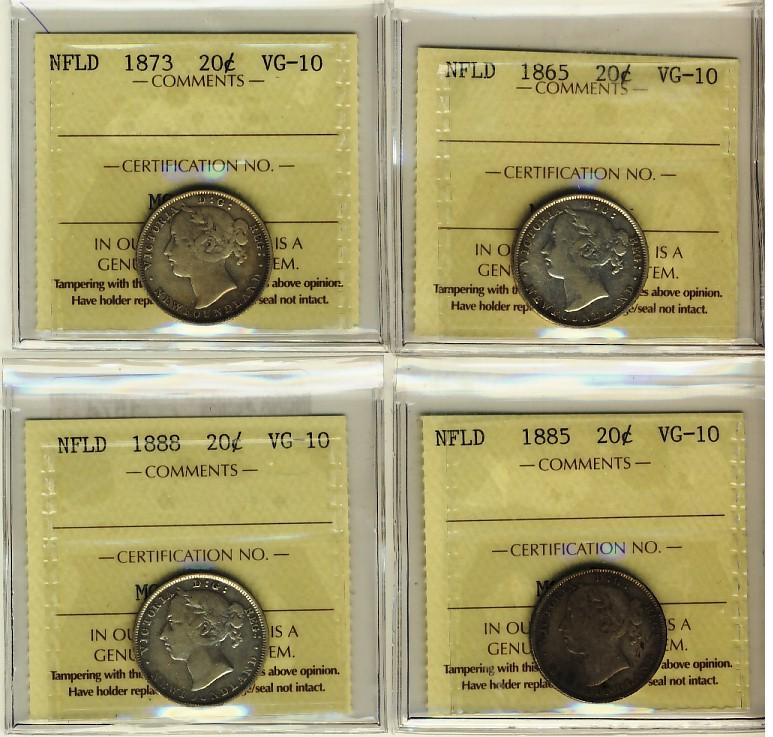 Nfld 1865 20¢, 1873, 1885 & 1888 ICCS VG10. Lot of 4 coins.