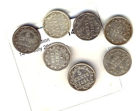 Nfld 1865 5¢, 1880, 1881, 1882H, 1888(2) & 1894. Lot of 7 coins all with issues, cleaning, digs etc… Should be viewed.