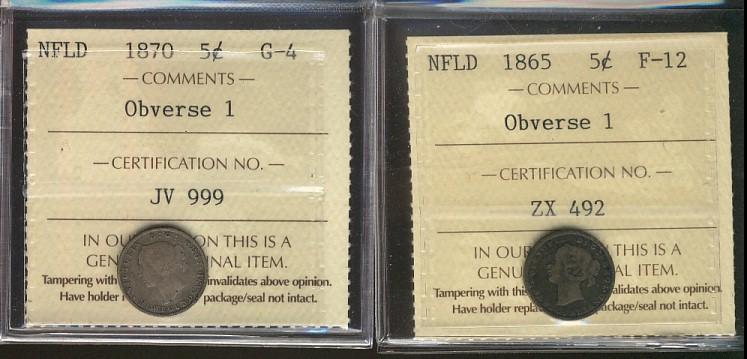 Nfld 1865 5¢ Obv 1 F12 & 1870 Obv 1 G4. Lot of 2 ICCS coins.