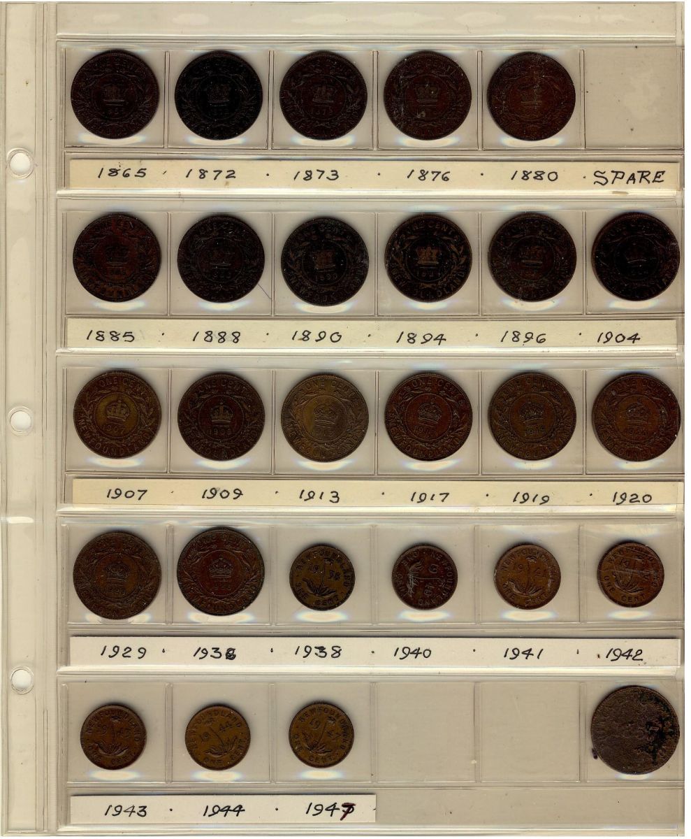 Nfld 1865 to 1947c 1¢. Lot of 27 pcs. No doubles in dates and 1 x 1857 Self Gov't and Free Trade token, heavily corroded. N.B. cents grade VG to VF. Catalogues $300