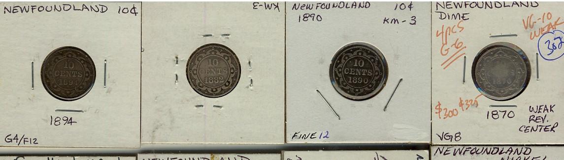Nfld 1870 10¢, 1882H, 1890, 1894, all G-6 or better, 4 pieces.