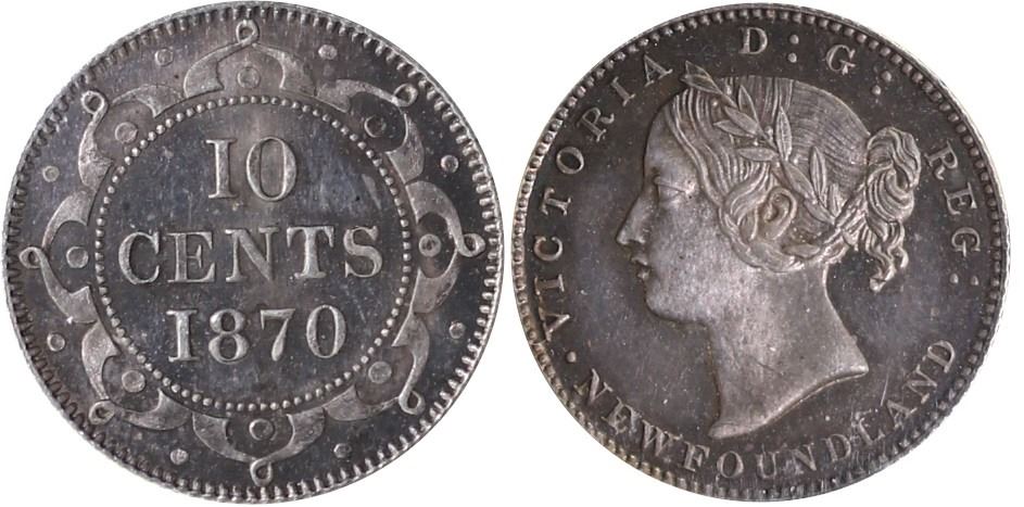 Nfld; 1870 10¢ "Obv.2" ICCS Gem Mint State-65. Delicate gold and russet tones over full underlying lustre. Proof-Like fields and "Cameo" contrast. A stunning razor sharp example. Rare and desirable.