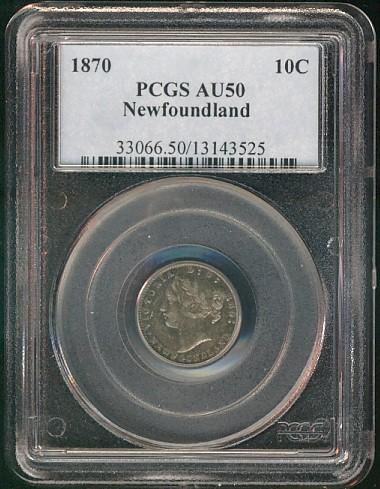 Nfld 1870 10¢ PCGS AU50. Obv 2, but not designated.