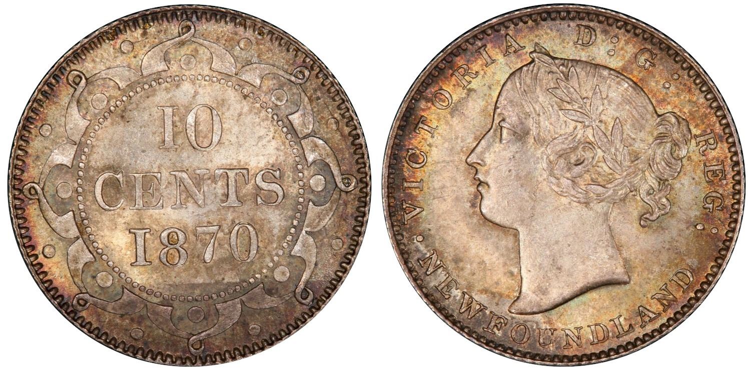 Nfld 1870 10¢ PCGS Superb Gem Mint State-66 An absolute sublime lustrous example with superb eye appeal. Should be considered as one of the most important date in the Nfld 10 cent series. Only 1 example graded in MS66 and only 1 piece certified MS67 at PCGS, making this example the second best known. This coin presents an important opportunity for Registry Set collectors. A highly attractive and beautiful example to add to the best of collections.