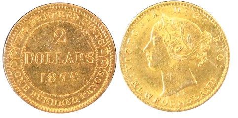 Nfld 1870 $2 Gold Obv 2 ICCS MS64. Gem lustre and superb fields. Well struck with exceptional surfaces and clean fields. The coin has full original lustre. The best of the best. The nicest example ever graded by ICCS and handled by the cataloguer. Worth a premium bid.