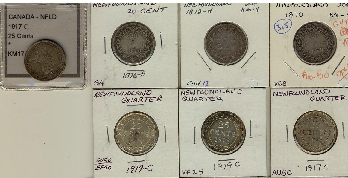 Nfld 1870 20¢, 1872H, 1876H, 1917c (2), 1919c (2) 25¢, Grades vary from G4 to VF30, 7 pieces.