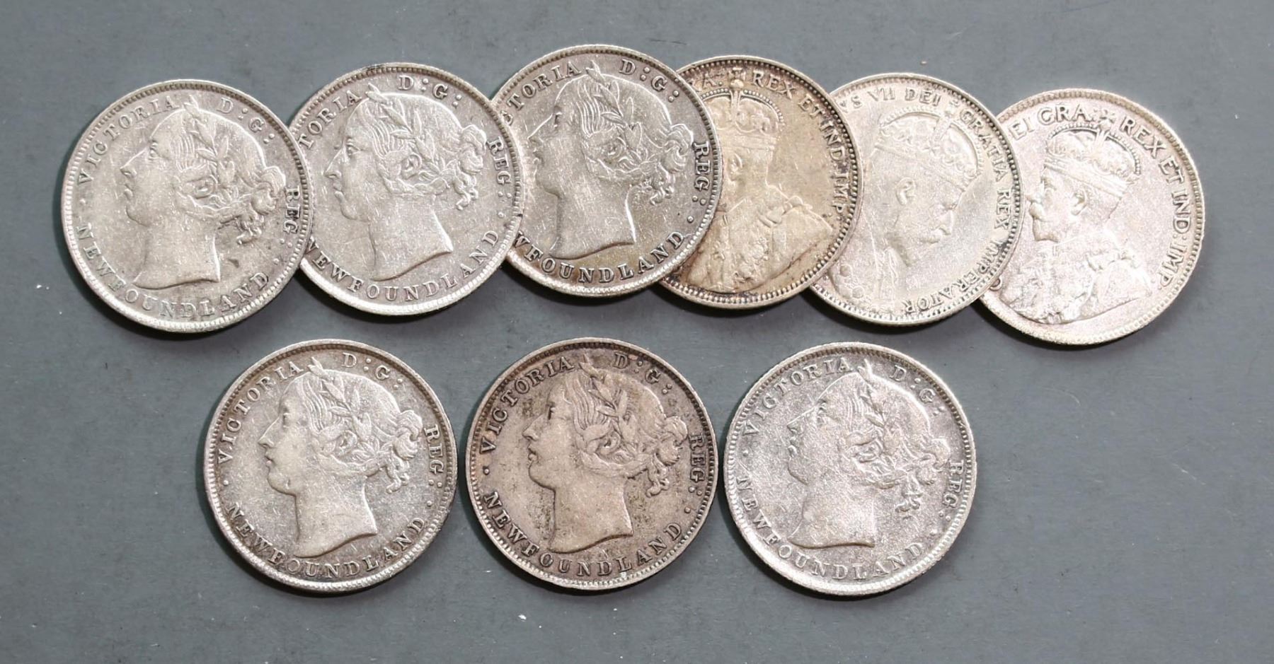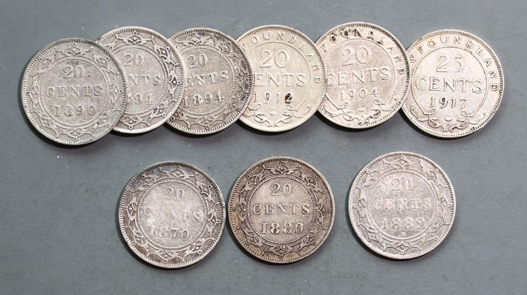 Nfld 1870 20¢, 1880, 1882H, 1890, 1894 (2), 1904H, 1912, 1917-C. All VF or better. Lot of 9 coins.
