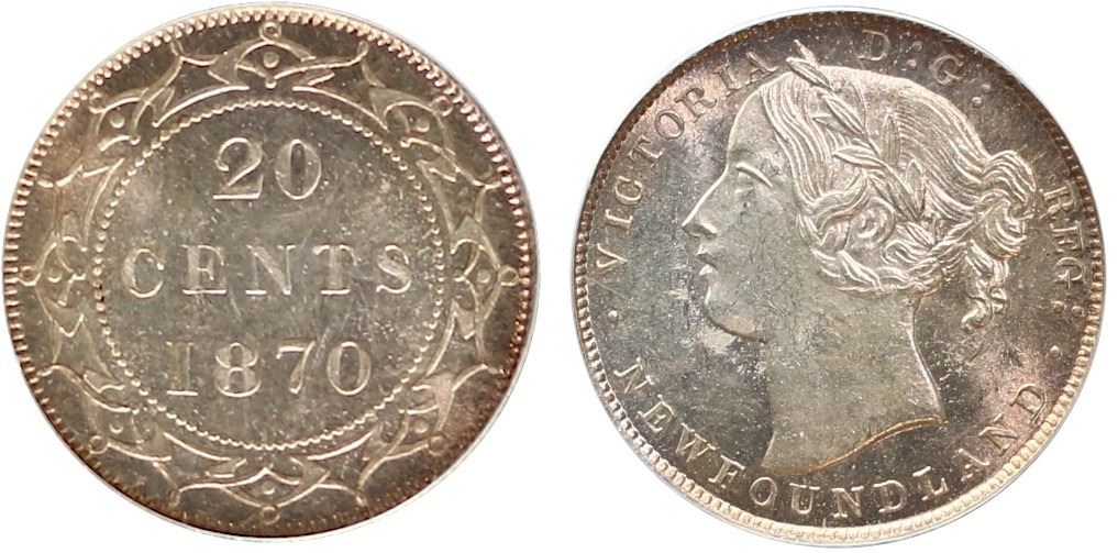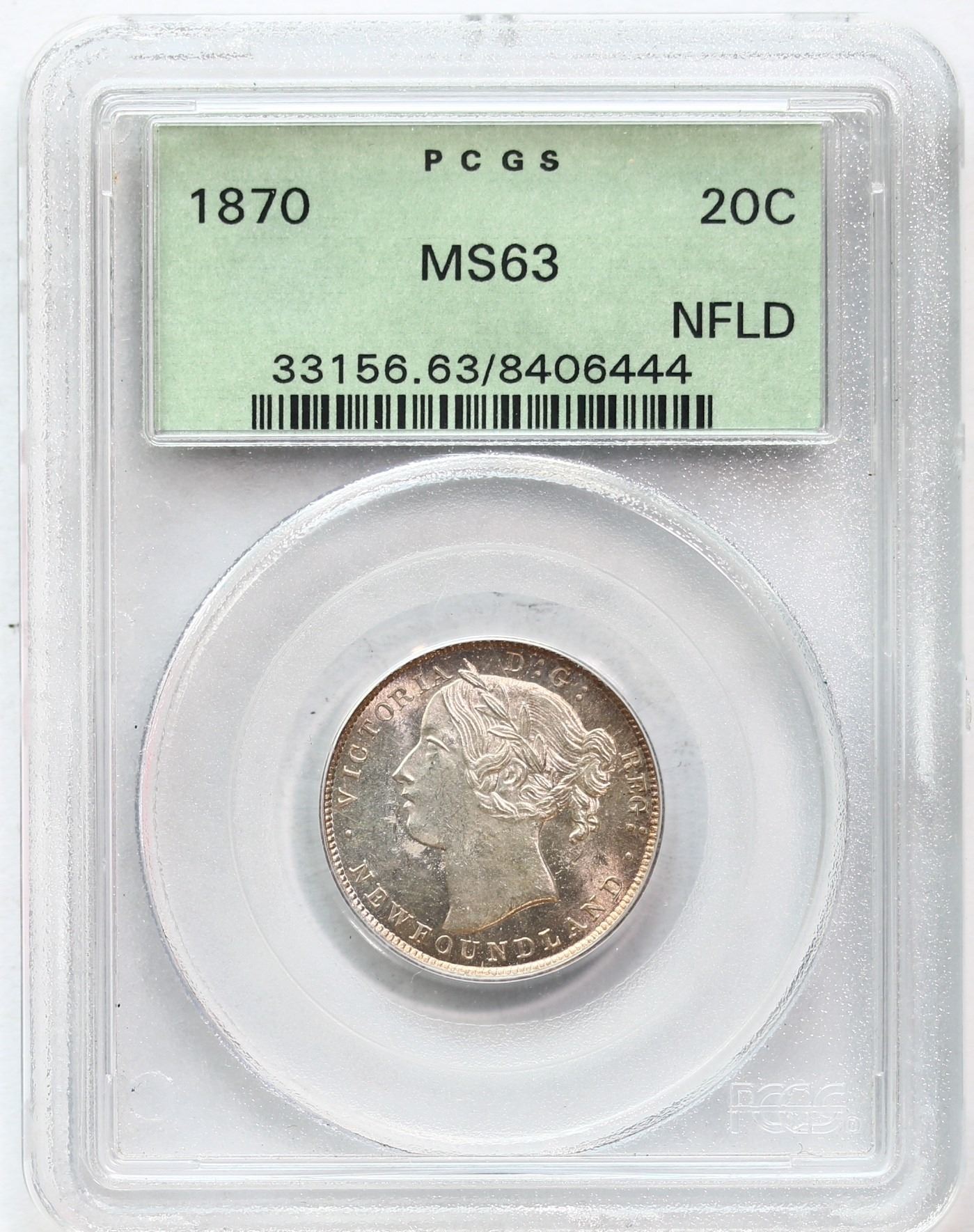 Nfld 1870 20¢ PCGS Choice Mint State-63 Fully brilliant and lustrous with just a hint of golden tone. A very flashy and desirable example.