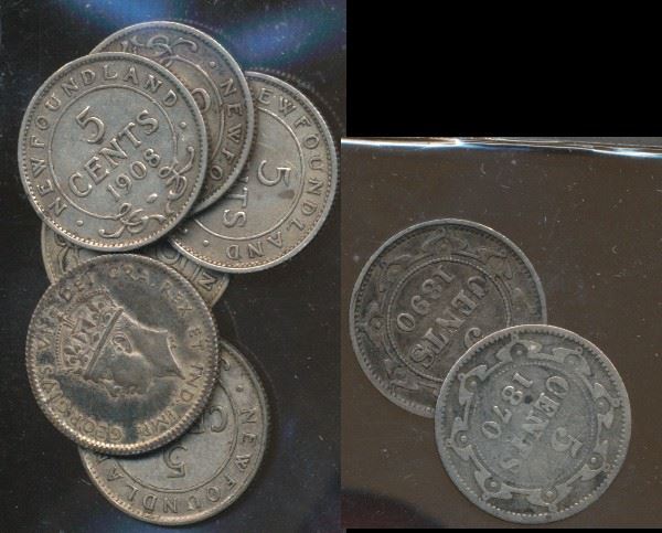 Nfld 1870 5¢, 1890, 1904H, 1908, 1917c, 1938, 1941c & 1947c. Lot of 8 coins VG to EF.