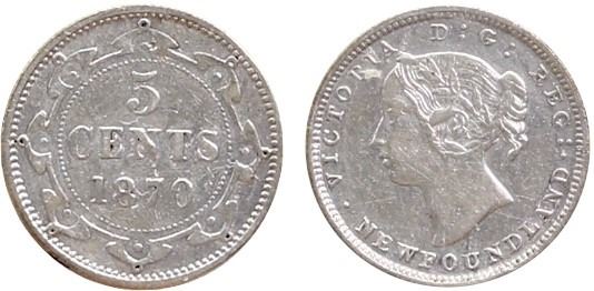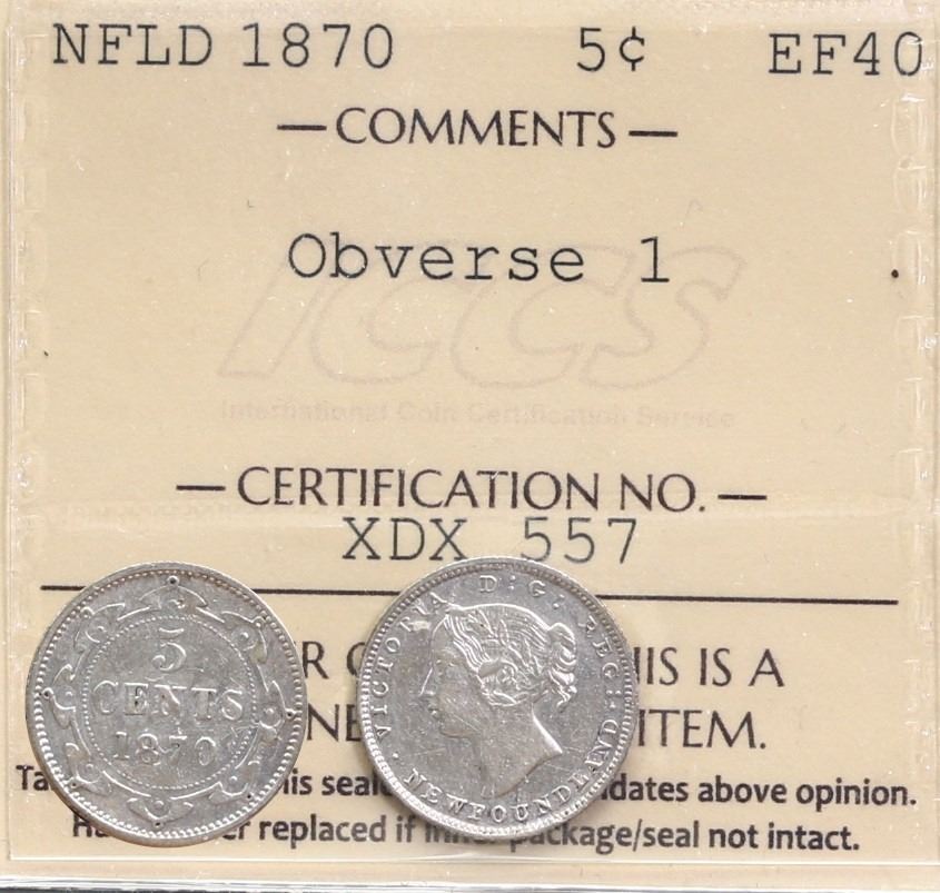 Nfld 1870 5¢ Obv.1 ICCS Extra Fine-40, seldom offered.