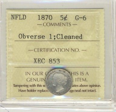 Nfld 1870 5¢ Obv 1 ICCS G6. Designated cleaned. Tough date.