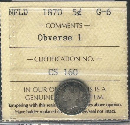 Nfld 1870 5¢ Obv 1 ICCS G6.
