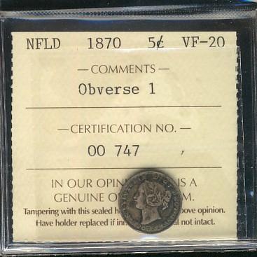 Nfld 1870 5¢ Obv 1 ICCS VF20.