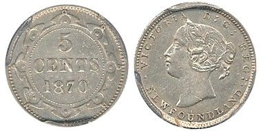 Nfld 1870 5¢ Obv 1 PCGS AU55, brilliant. Very scarce.