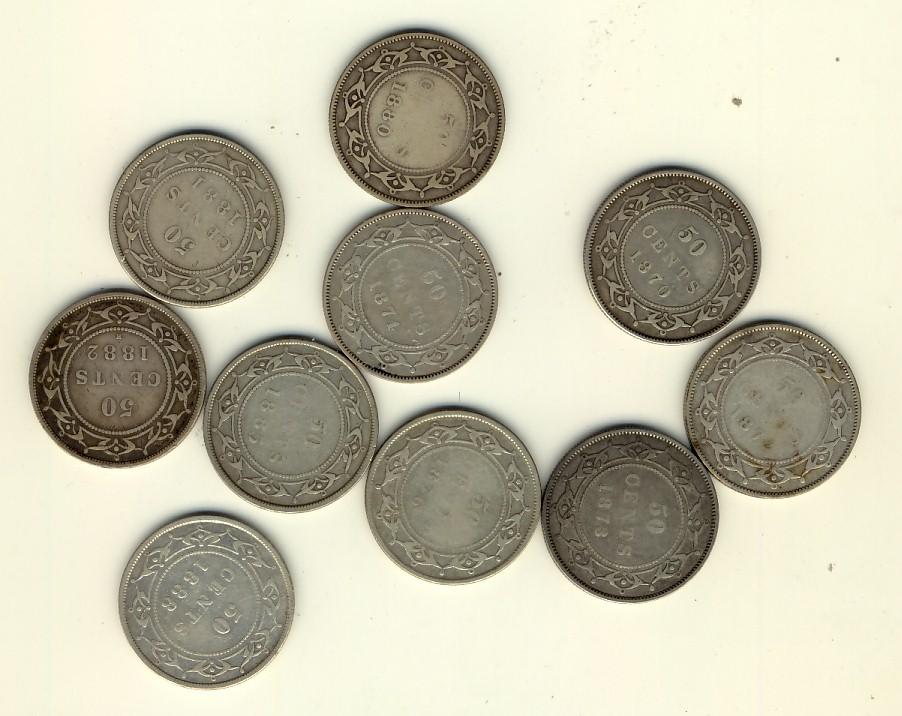 Nfld 1870 50¢, 1872H, 1873, 1874, 1876H, 1880, 1881, 1882H, 1885 & 1888. Lot of 10 coins all Good t
