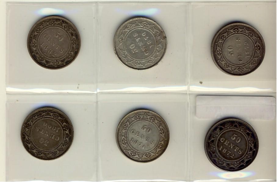 Nfld 1870 50¢, 1872H, 1873, 1874, 1882H & 1900. Lot of 5 coins all VF or better. Should be viewed.