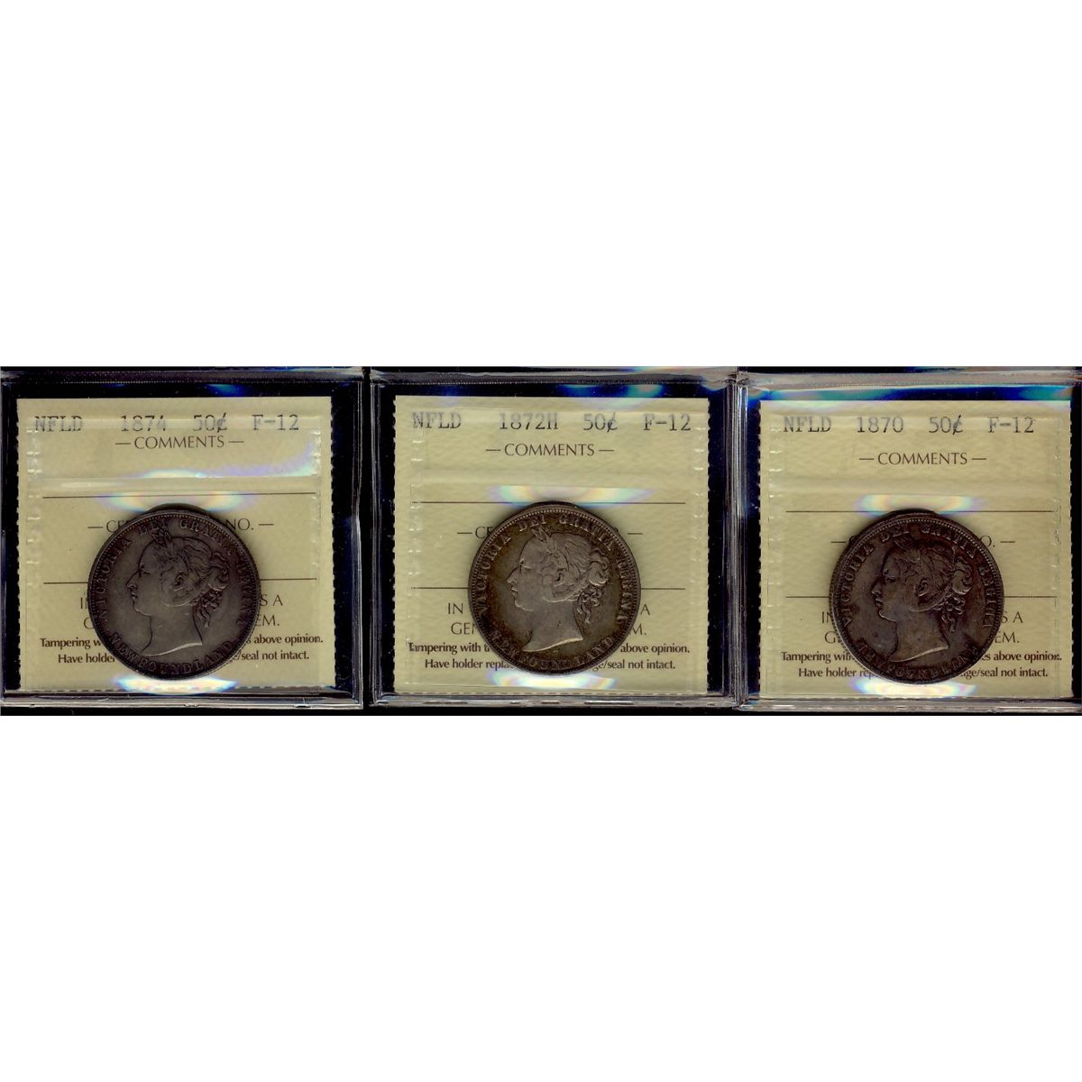 Nfld 1870 50¢, 1872H & 1874 ICCS F12. Lot of 3 coins.