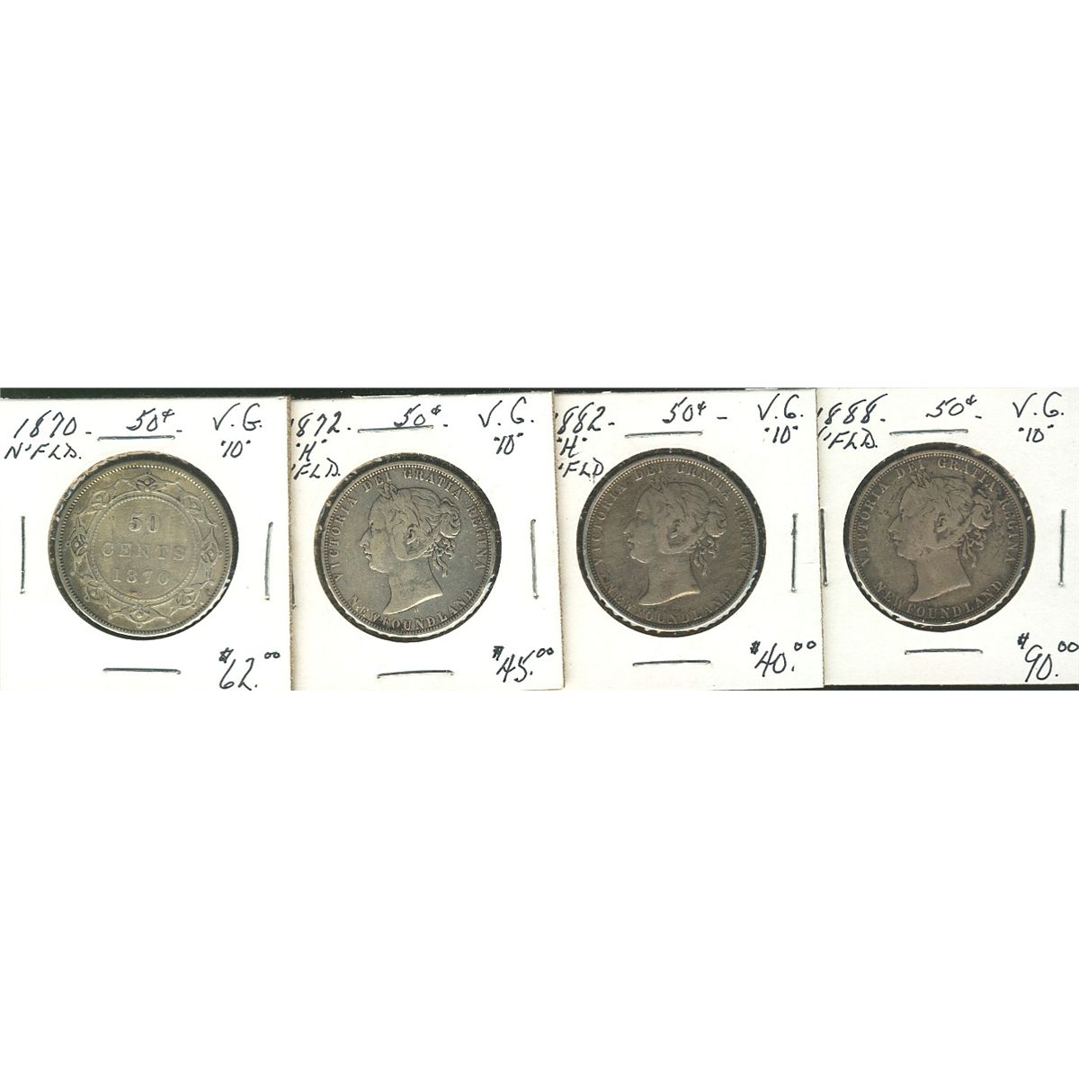 Nfld 1870 50¢, 1872H, 1882H &1888. Lot of 4 coins all VG10. (PBA).