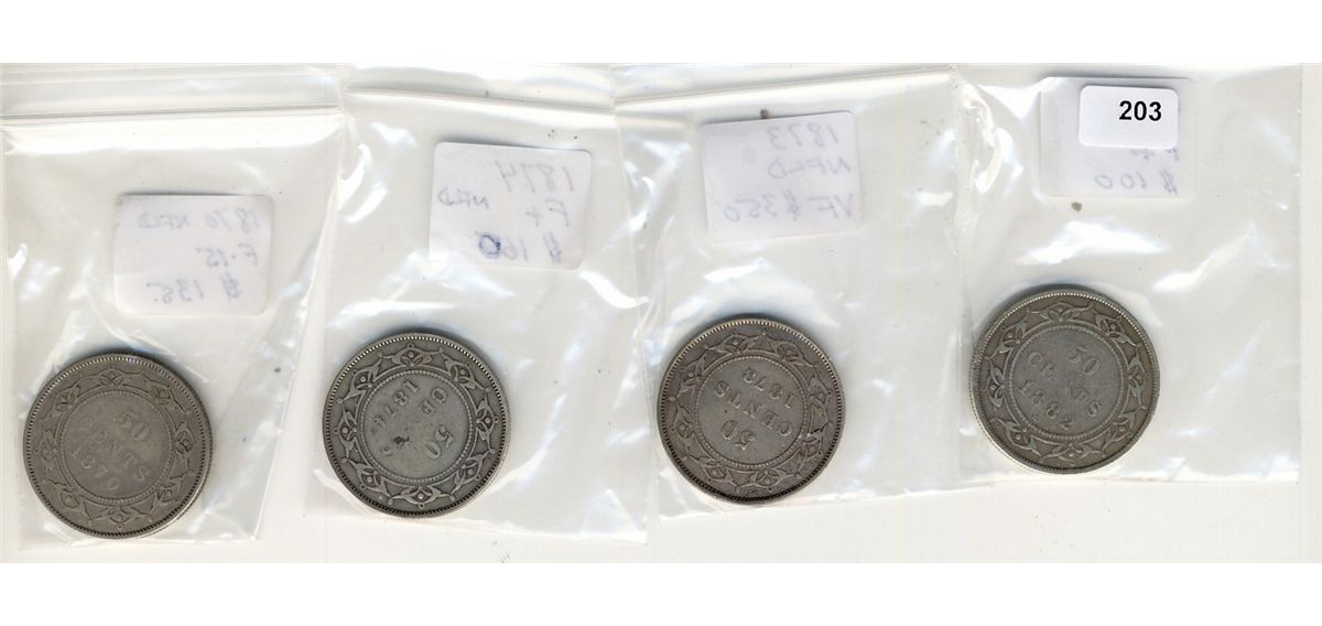 Nfld 1870 50¢, 1873, 1784 & 1882H. Lot of 4 coins, VG to Fine.