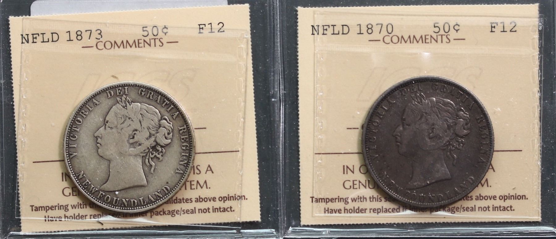 Nfld 1870 50¢, 1873 Both coins ICCS Fine-12