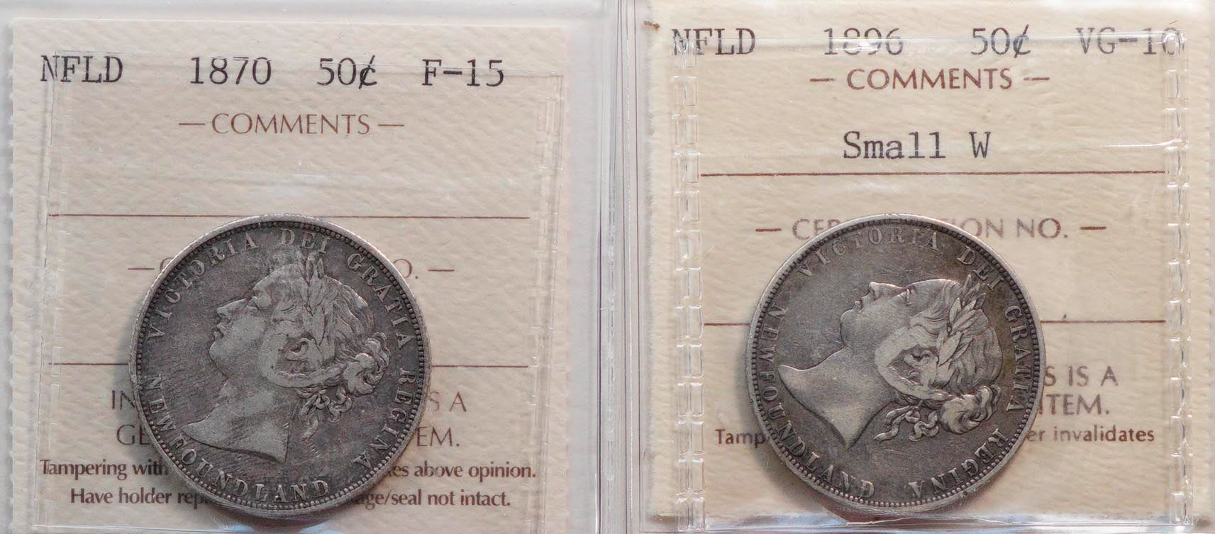 Nfld; 1870 50¢, 1896 "Sm W". Both coins ICCS Very Good-10 to Choice Fine-15