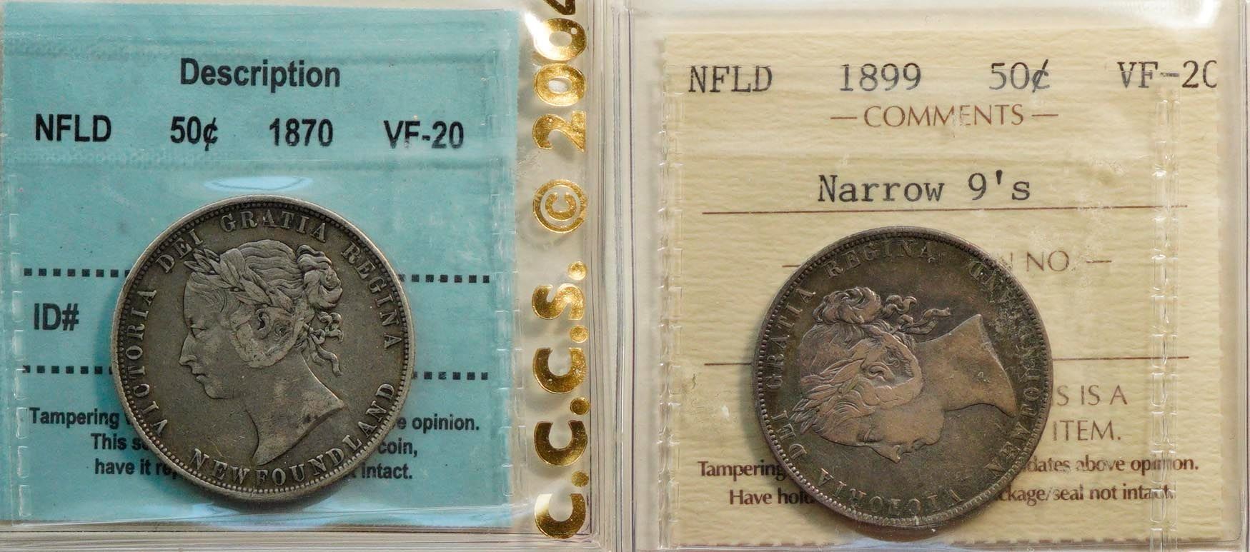Nfld; 1870 50¢, 1899 "N9's". Both coins ICCS/CCCS Very Fine-20