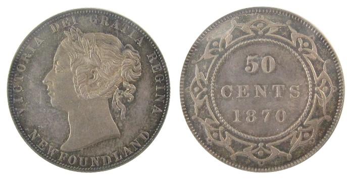 Nfld 1870 50¢ PCGS SP65 Plain Edge example. Intense shades of Grey and Gold with underlying lustre. Tied Top 3 graded. Excessively rare.
