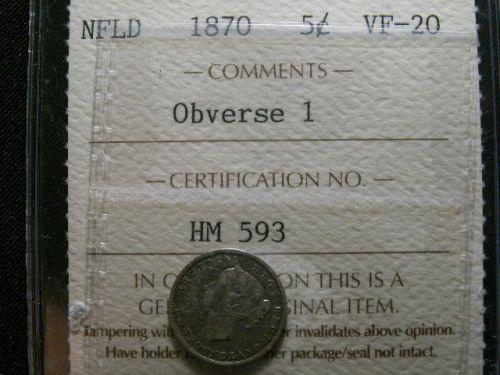 Nfld 1870 Obv.1 5¢ ICCS VF20, lightly toned.