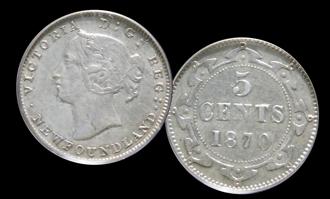 Nfld 1870 Obv.1 5¢ PCGS AU50, mostly brilliant. Scarce in this condition.